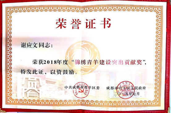 2019年7月,經中共成都市青羊區委辦公室、成都市青羊區人民政府辦公室評選,集團董事長、總裁謝應文榮獲2018年度“錦繡青羊建設突出貢獻獎”先進個人稱號。