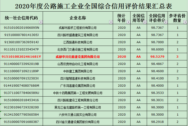 集團連續(xù)四年榮獲交通運輸部公路施工企業(yè)全國綜合信用評價“AA”級,得分98.53分,再創(chuàng)歷史新高。